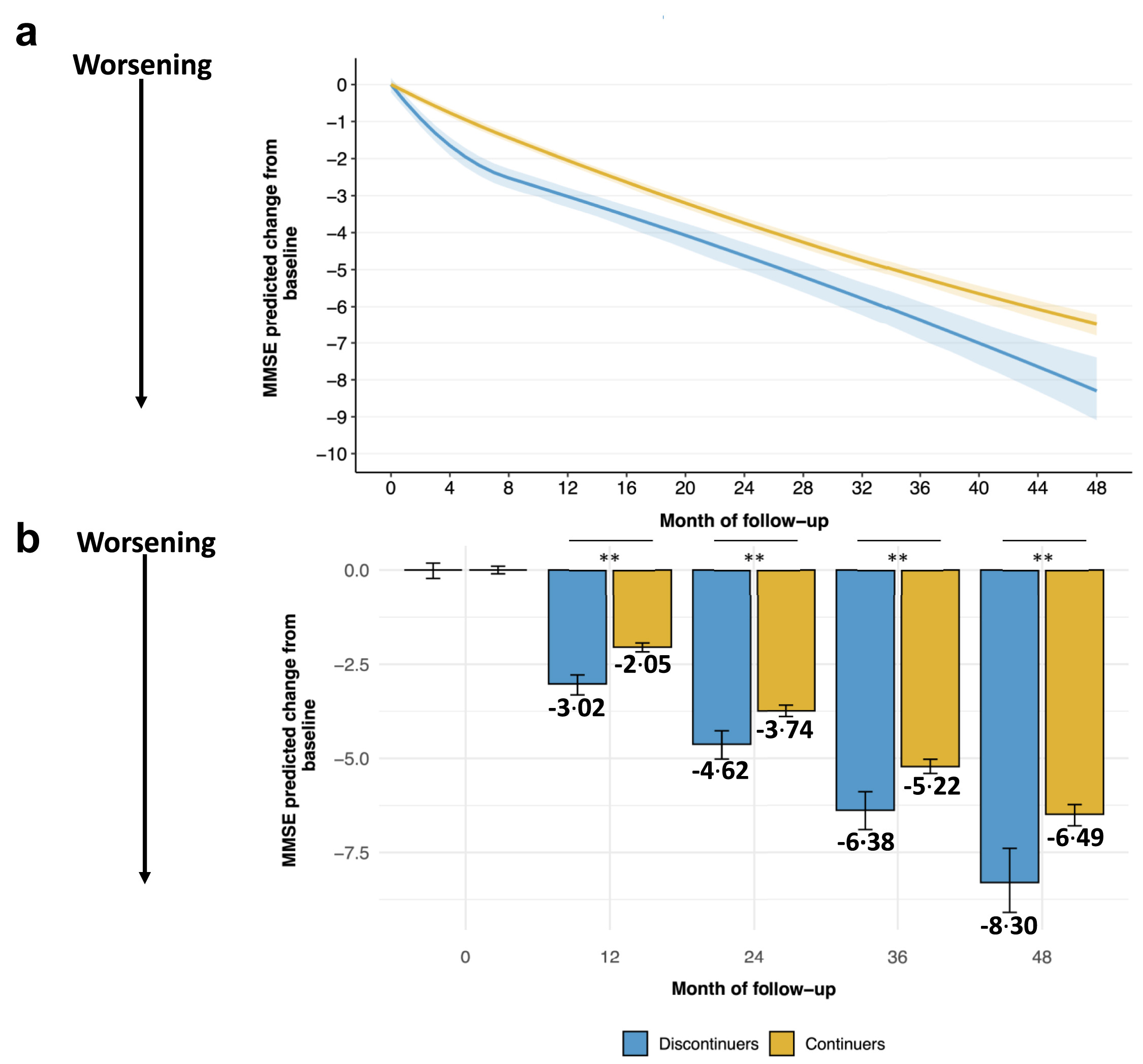 上のaのグラフでは黄色の線が継続群、青い線が中止群。下に下がるほど認知機能が低下することを意味していますが、一貫して黄色の方が下降が緩やかです。